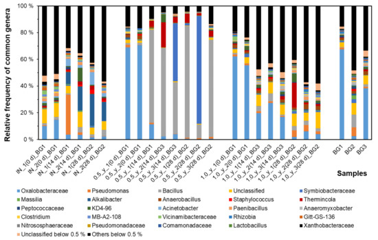 Various facultative anaerobic nitrate-reducing (NRB) genera such as Alkalibacter, Acinetobacter, Bacillus, Pseudomonas, Paenibacillus, Symbiobacterium, or Massilia, or iron-reducing (IRB) genus Thermincola were detected in BCV_IN samples. All of these genera are typical for Czech Mg/Ca bentonite [38]. Much lower genera diversity was found in the BCV_0.5_y samples. After 14 or 28 days of cultivation, the suspensions contained mostly the NRB genus Bacillus or the IRB genus Thermincola. In the samples 0.5_y_3(14 d)_BG3 and 0.5_y_2(28 d)_BG2, the presence of an unspecified bacterial clone from the family Symbiobacteraceae was detected. Sequencing of DNA from BCV_1.0_y samples resulted in poor NGS results. Only sample 1.0_y_1(28 d)_BG2 showed an increased frequency of the thermophilic genus Thermincola compared with the background controls (BG) co-extracted with the samples. This result indicates that, although the relative increase in 16S rDNA copy numbers in the BCV_1.0_y samples cultivated for 28 days was detected, this increase did not result in sufficiently high absolute gene copy numbers for successful NGS analysis. Microbial composition of all zero-point samples was very similar to the pattern detected in co-extracted background controls, which reflects their very low DNA content and lack of DNA signal similarly to the situation observed in 1.0_y samples. The only difference was observed in IN_1(0 d) and IN_2(0 d) samples, with lower proportion of Oxalobacteraceae family members compared to BG1 control. However, the relative frequencies of particular taxa are rather sensitive to several biases introduced during DNA extraction and PCR in low-DNA samples, and we consider the observed difference insignificant.