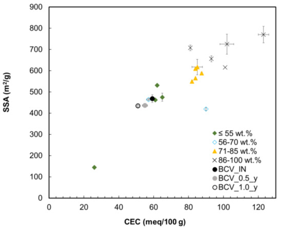 To support the finding of reduced montmorillonite content, which could not be confirmed using XRD, data analysis of CEC, SSA was performed. The interlocking of SSA, CEC and smectite content is illustrated in Figure 8. Data selection (see Table 6) was mainly restricted by existing SSA values measured according to the EGME method. Previously published data were compared with the results from the current study. Five groups of bentonites can be distinguished corresponding to their smectite content. The lowest SSA and CEC values are typical for bentonites containing up to 50 wt.% of smectite. The highest SSA and CEC values are typical for bentonites containing almost 100 wt.% of smectite. The CECVis and SSA values of the BCV_IN sample correspond well with the correlation matching the group of bentonites containing 50–80 wt.% of smectite.