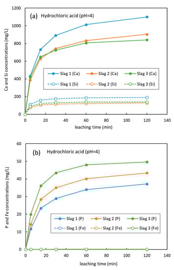 The dissolution behavior of each dephosphorization slag in the hydrochloric acid solution at pH 4 is shown in Figure 2. The concentrations of the main elements in the solution increased continuously with leaching time. In the beginning, the dissolution of Ca, Si, and P from slag was very fast, resulting in higher concentrations in 20 min, indicating that the C2S–C3P solid solution was dissolved easily. The dissolution rate of slag gradually decreased, and the concentrations of the main elements showed a slight increase after 60 min. The Ca concentration was the highest among the dissolved elements, while the Fe concentration was very low in each case, illustrating that the dissolution of Fe-bearing mineral phases was difficult. A higher Fe2O3 content in slag led to lower Ca and Si concentrations in the solution. When the Fe2O3 content increased from 24.0% to 36.0%, the Ca concentration decreased from 1100.3 mg/L to 841.7 mg/L after 120 min. The Si concentrations from slag 2 and 3 were very similar, approximately 130 mg/L after 120 min. This is because the mass fraction of C2S–C3P solid solution was lower in the slag with high Fe2O3 content. Contrary to Ca and Si, the P concentration in the solution increased significantly with the Fe2O3 content in slag. For slag 3, the P concentration reached 49.7 mg/L. Due to the extremely low Fe concentration, the P-containing solution is suitable for phosphorus recovery. It has been reported that calcium phosphates could be extracted from this kind of solution by chemical precipitation [23].