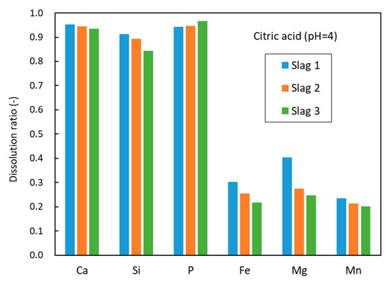 Citric acid was commonly used as a leaching agent in previous studies [21,22,23]. To understand the effect of acid and select an appropriate leaching agent, the dissolution behavior of dephosphorization slag with different amounts of Fe2O3 content in citric acid solution was also investigated. Figure 5 shows the dissolution ratio of each element from slag at pH 4. Compared to the leaching results in Figure 3, dephosphorization slag was easier to dissolve in the citric acid solution. Almost all the Ca, Si, and P was dissolved, and the dissolution ratios of Fe, Mn, and Mg were relatively high. In the citric acid solution, citrate ions (C6H5O73−) could combine with Ca2+ and Fe3+ ions to form complexes [25]. It has been reported that the formation of complexes on the surface of the mineral phase shifts the electron density toward the metal ion, which destabilizes the crystal lattice and facilitates the detachment of metal ions into aqueous solutions [26]. Therefore, citric acid was more effective to dissolve slag, resulting in a higher dissolution ratio of each element. As the Fe2O3 content in slag increased, the dissolution ratio of P increased slightly, while those of other elements decreased. The dissolution ratios of P and Fe from slag 3 were 96.7% and 21.7%, respectively, illustrating that a part of the Fe-containing mineral phases was also dissolved.