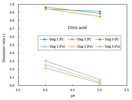 Dissolution ratio of each element from dephosphorization slag in citric acid solution at various pH conditions.