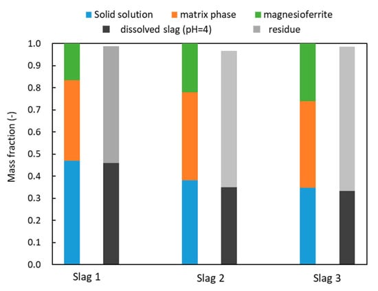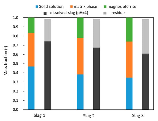 The mass fraction of dissolved slag was calculated using the dissolution ratio of each element. Figure 7 presents the mass fractions of mineral phases and dissolved slag in the hydrochloric acid solution at pH 4. In slag 1 with low Fe2O3 content, the mass fraction of solid solution was approximately 47%, and that of magnesioferrite was relatively low. With the increase in Fe2O3 content, the mass fraction of solid solution decreased, while that of magnesioferrite increased. This result was consistent with the EPMA analysis. There was no significant change in the mass fraction of the matrix phase. The mass fraction of dissolved slag decreased with the increase in Fe2O3 content. In each case, the mass fraction of dissolved slag was slightly lower than that of the solid solution. Because the C2S–C3P solid solution was readily dissolved, it was found that a large amount of the C2S–C3P solid solution was dissolved and separated from slag. However, the dissolution ratio of P from slag 1 was not high, and a part of Mg and Mn was also dissolved. As discussed above, it is considered that a part of the P dissolved from the solid solution was precipitated with Fe3+ ions dissolved from slag under this condition. For slag 3, the dissolution ratio of P was the highest, illustrating that almost all the C2S–C3P solid solution was dissolved and the phosphate precipitation was not significant.