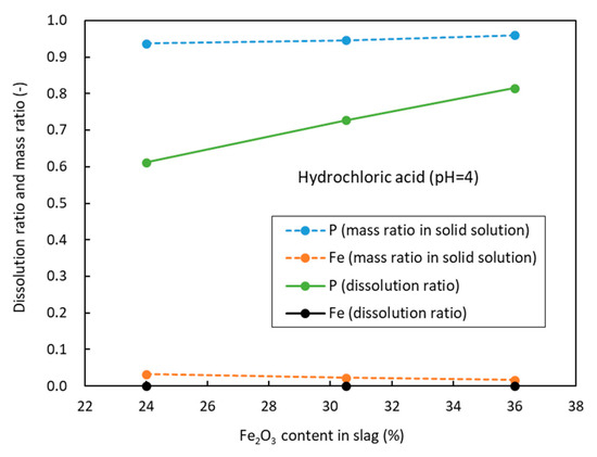 In summary, increasing the Fe2O3 content in slag promoted the dissolution of P and simultaneously suppressed the dissolution of other elements. Better selective leaching of P from dephosphorization slag was achieved in the hydrochloric acid solution at 4. Although the dissolution ratio of P was slightly lower than that in the citric acid solution, the dissolution ratio of Fe was negligible in the hydrochloric acid solution. From the perspective of treatment cost, hydrochloric acid was considered an appropriate leaching agent.