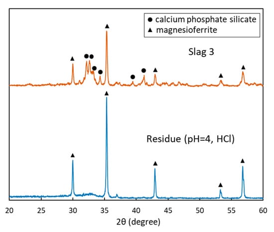 XRD patterns of slag 3 and its residue after leaching in hydrochloric acid solution at pH 4.
