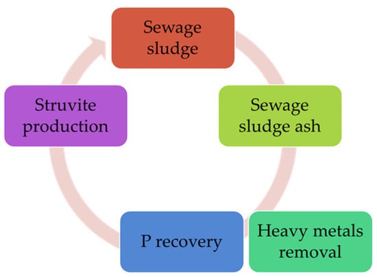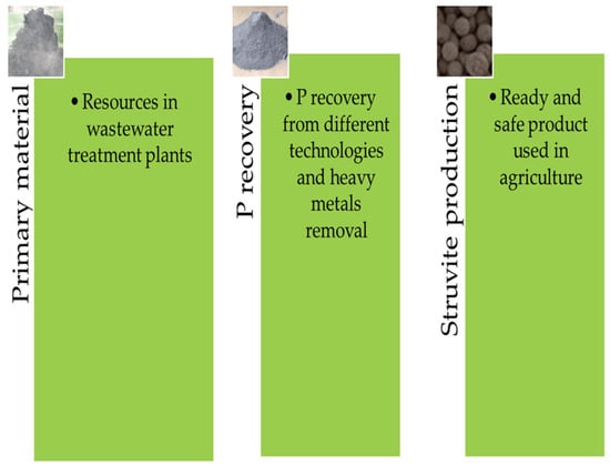 Challenges and opportunities in the introduction of struvite production were considered to propose the requirements for a sustainable nutrient management strategy (i.e., P recovery and recycling from SSA). The presented study mainly covers P recovery from SSA and marketed technologies allowing P recovery and HMs removal. The data collected and analyzed from the available literature allowed us to present an overall view of struvite formation based on the circular economy. The key aspect is the use of P-rich materials) through the removal of impurities so that the resulting product is safe (Figure 2).