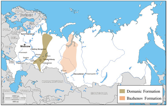 The Domanic Formation is located within Volga-Ural and Timan-Pechora sedimentary basins on the European part of the Russian Federation (Figure 1). In terms of the composition, Domanic shales are represented predominantly by organic-rich limestones such as wackestone and packstone, the role of the siliceous rocks is minor. The formation is aged as Upper Devonian (Fransian) and characterized with variable thickness 10–45 m, total organic carbon is in the range of 1–30 wt%, kerogen type II or mixed type II-III [8,9,10].