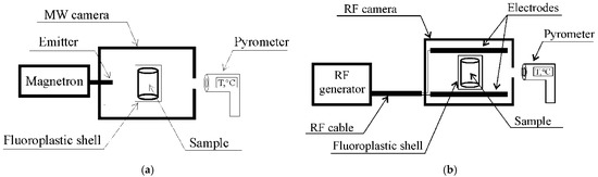 Schemes of experimental setups for electromagnetic influence on source rock samples in (a) microwave field and (b) radio-frequency field.