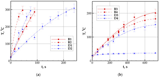 Microwave treatment causes very rapid heating of all samples (Figure 4a): the temperature of the samples rises up to approximately 300 °C during a short period of time of less than 2 min. Further heating of the samples (above 300 °C) was impossible due to the design features of the experimental setup due to the threat of the heat-insulating cell melting. It can be seen that the Bazhenov Formation sample B2 heats up the fastest (), samples B1 and D2 show approximately the same heating dynamics (, ), and the Domanik sample D1 heated up the longest ().