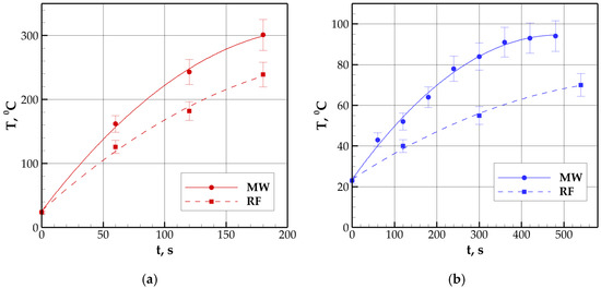 The analysis of the curves that is shown in Figure 13a allows one to conclude that an increase in the time of the microwave treatment will lead to a further increase in the temperature of all the samples and will allow to reach the temperatures of 400–500 °C required for the pyrolysis of kerogen. The same conclusion cannot be drawn for the case of the radio-frequency treatment since it is clearly seen in Figure 13b that the heating rate decreases and an increase in treatment time will most likely not lead to a significant increase of the sample temperature.
