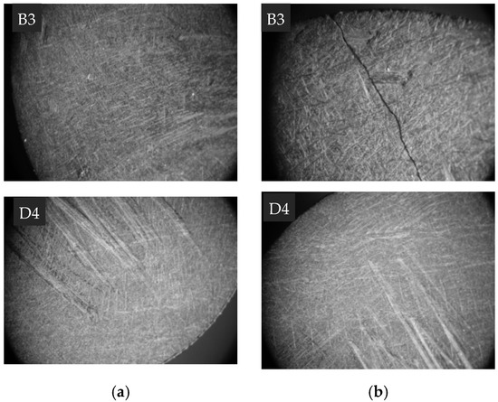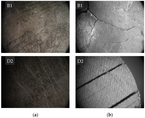 Samples B1 and D2 were heated up to approximately the same temperatures (286 °C and 293 °C, respectively) under the microwave field impact. Therefore, larger cracks formed on the surface of both samples after the microwave influence (Figure 7).