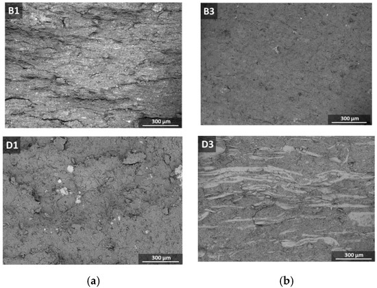 Scanning electron microscope images of samples (a) B1, D1 and (b) B3, D3 after the electromagnetic treatment.