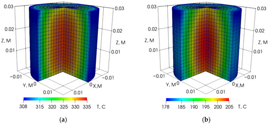 Whereas the temperature of the sample surface was measured in the experiments, the numerical simulation allows one to obtain the temperature at all points of the sample. The typical temperature distribution in the volume of the oil source rock samples under the microwave and radio-frequency impact are shown for two Bazhenov Formation samples B2 and B3 in Figure 10. This figure shows that the temperature is approximately 20 °C higher at the sample center than on its surface. The surface temperature decreases due to the intensification of heat exchange with the environment when the sample temperature increases.