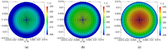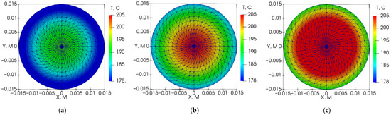 Figure 10 shows that there is a gradual increase in the temperature throughout the sample. The qualitative picture of the temperature distribution is identical to the case of the microwave exposure. Temperature differentiation is also observed in the middle and vertical sections. The temperature in the center of the sample is higher than that at the surface. As in the case of the microwave exposure, the temperature difference between the center and the upper part reaches 3 °C; between the center and the lateral surface it rises up to 20 °C and increases with time. Such inhomogeneity of the absorption of the field energy and the arising temperature gradients in a real medium may turn out to be much higher. In this case, the characteristic time of the radio-frequency heating of the samples to a temperature identical to the microwave action increases considerably. This is due to the change in the absorption capacity of the substance saturating the samples with a change in the frequency of the applied field [29]. However, it should be noted that the coverage factor of the radio-frequency exposure is significantly higher than that of the microwave exposure. If it is necessary to heat only the bottomhole zone, it is advisable to use the microwave range but for heating the zone far from the bottom one should resort to the radio-frequency range.