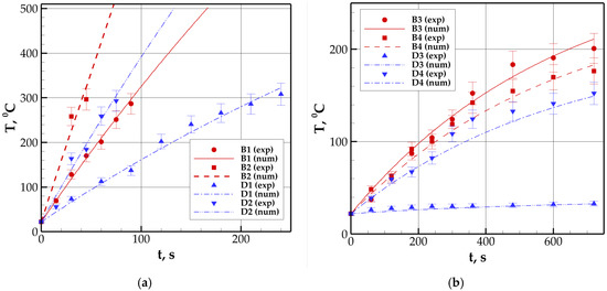Comparison of the experimental data and the numerical modeling results for heating dynamics of source rock samples under the influence of (a) the microwave electromagnetic field and (b) the radio-frequency electromagnetic field.