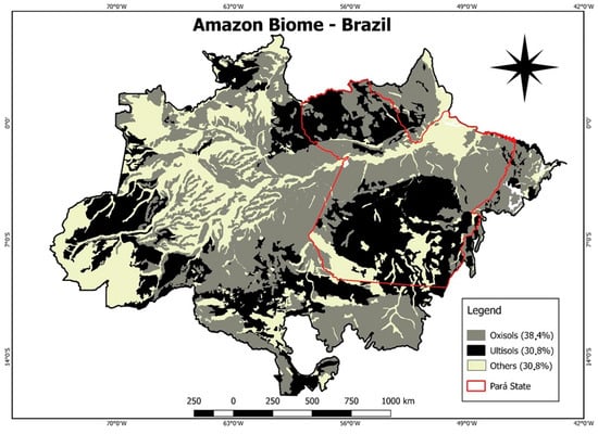 - Souza, E.S.; de Fernandes, A.R.; De Souza Braz, A.M.; Oliveira, F.J.; de Alleoni, L.R.F.; Campos, M.C.C. Physical, chemical, and mineralogical attributes of a representative group of soils from the eastern Amazon region in Brazil. SOIL 2018, 4, 195–212. [Google Scholar] [CrossRef] [Green Version]