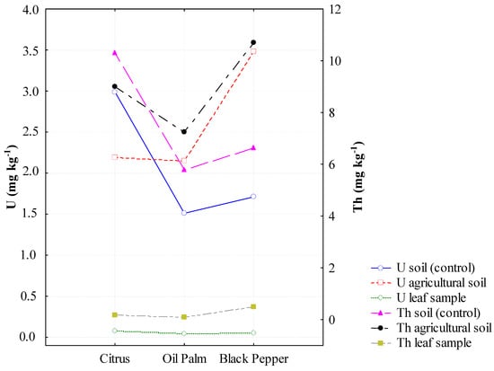 Soil pH is among the most important drivers of the U mobility [74]. Low pH increases U mobility and availability, favoring absorption by plants [75]. It is known that U can be more mobile and bioavailable in the soil than Th [76]. However, it has been reported that Th can form soluble complexes with humic acids in the rhizosphere, and plants can easily absorb Th in this form [77]. Comparing the bioaccumulation of U and Th among the three crops studied, a higher BAF was observed for U compared to Th in citrus and black pepper cultivation. The bioaccumulation of Th in oil palm leaves was three times greater than that of U. In addition to the edaphoclimatic factors that control the bioavailability of radioelements in the rhizosphere, there is a natural difference in the absorption capacity of plants [12].