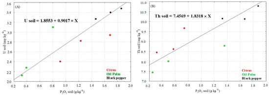 The average concentrations of U and Th in soils cultivated with black pepper (3.48 and 10.70 mg kg−1, respectively) and oil palm (2.15 and 7.25 mg kg−1) were higher than those found in the reference areas, while the citrus cultivation showed concentrations lower than the reference area (Figure 2, Table S1). In the agricultural soils in this study, the concentrations of U and Th showed positive correlations with the levels of P2O5 (Figure 3). The enrichment factors were less than 2 (EF < 2) and showed the following orders: U—black pepper > oil palm > citrus; Th—oil palm > black pepper > citrus (Figure 4A).