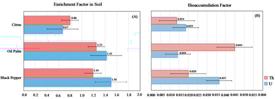 The average concentrations of U and Th in plant tissues were, respectively, 0.08 and 0.18 mg kg−1 for citrus, 0.05 and 0.48 mg kg−1 for black pepper and 0.04 and 0.10 mg kg−1 for oil palm (Figure 2, Table S1). The bioaccumulation factors of U and Th for the three crops were extremely low, with BAF values < 0.05 (Figure 4B). In soils, with the exception of the citrus soil, all the areas showed higher activity concentrations of 238U and 232Th compared to the reference areas (Table 2). The activity concentration of 232Th in the tissue of black pepper was extremely high (1948.8 mBq kg−1) (Table 3). The activity concentrations of the radioelements in the plant tissues followed the orders: 238U (mBg kg−1) − citrus > black pepper > oil palm; 232Th (mBg kg−1) − black pepper >> citrus > oil palm.