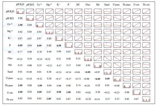 Strongly positive Pearson’s correlations were found between U and pH, Ca2+, K+ and P in the soil, while the most significant correlation of Th was with Mg (Figure 5). The level of U in plant tissues showed a negative correlation with the silt content and a strong positive correlation with the sand content of the soils. Regarding the Th concentration in plants, it showed a strong positive correlation with pH and Ca+ of the soils (Figure 5).
