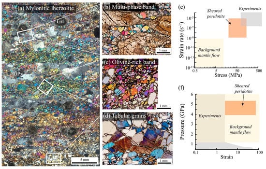 Analysis of rock microstructure and fabric (e.g., grain size and texture) by solid-state deformation serves as a tool for reconstructing the mechanical and thermo-chemical conditions of deformation (e.g., [1]). Understanding how mantle microstructure evolves with deformation under various conditions is particularly important for assessing the prevailing rheological flow laws and for our ability to understand mantle kinematic and dynamic properties from seismic data. However, many variables can affect the grain size and texture of peridotitic samples, including: differential stress, mechanism of deformation, water content, pressure, temperature, melt fraction, degree of annealing, pre-existing texture, and the fraction and distribution of auxiliary minerals such as pyroxenes and garnet [2,3,4,5,6,7,8,9,10,11]. Most constraints for the microstructural evolution come from laboratory experiments where the stress, pressure, temperature, chemical environment, and initial fabric are well-constrained [12,13,14,15,16,17,18,19]. Therefore, microstructures of natural samples are interpreted and benchmarked by comparison with experimentally induced microstructures. Nonetheless, this comparison is hampered by the necessary extrapolation of strain rate. Due to the limited timescale of laboratory experiments, strain rates from the lab (~10−4–10−7 s−1) typically differ by orders of magnitude from strain rates in the mantle (~10−10–10−15 s−1). Other experimental challenges include deforming multiphase samples (since trade-off between temperature and strain rate is hindered by melting) under high confining pressure and high strains (ɣ ≥ 10) (e.g., Figure 1e,f).