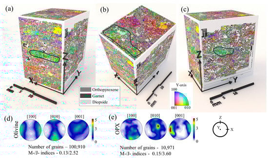 3-D representation of the microstructure on three orthogonal planes: (a) X-Z plane, (b) X-Y plane, and (c) Y-Z plane. Note that the three planes shown are not spatially connected at their edges. (d,e) Pole figures (area-weighted) of the crystallographic preferred orientation (CPO) for olivine (d) and orthopyroxene (e). Dark outlined polygons delineate the characteristic shape of three groups of grains with self-consistent orientations.