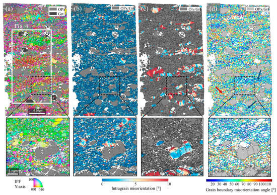 To further examine the style and mechanism of deformation, we used intragrain misorientation maps (“mis2mean”) depicting the orientation variations within crystals caused by geometrically necessary dislocations associated with deformation by dislocation creep. Most of the olivine grains had low intragrain misorientation, with only a few grains with total misorientation over 5° (warm colors in Figure 3b,c). The latter population of grains included medium-size porphyroclasts and smaller, often elongated, euhedral grains, suggesting previously strained grains with recrystallized grains at their boundaries, either during dynamic or static conditions [54]. Large opx porphyroclasts with high intragrain misorientations showed small recrystallized opx grains at their boundaries with low intragrain misorientation that often formed a characteristic “tail” structure ([6,55]). The degree of recrystallization was significantly lower for the opx grains, easily visible when comparing the ratio between the cool colors (recrystallized grains) and the warm colors (porphyroclast grains) in olivine (Figure 3b) and opx (Figure 3c). Garnet grains were relatively large (~2 mm in diameter) and round with negligible intragrain misorientation, suggesting that they did not deform significantly by internal plastic deformation.
