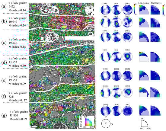 The X-Z cross-sections of the mylonite (Figure 1 and Figure 3) show characteristic banding with regard to olivine, opx, and garnet modal abundance. These bands consist of either only olivine (“monophase”) or olivine with opx/garnet (“multiphase”) and are ~2 and 5 mm wide, respectively. The olivine–olivine grain boundary misorientation map in Figure 3d illustrates that the mono/multiphase bands are also distinguished by lower/higher grain boundary misorientations, respectively (Figure 3d). To analyze the microstructural properties of individual bands, we used a higher-resolution map (3 μm step size) of the X-Z plane (area delineated with white frame in Figure 3a). The analysis of different bands demonstrates a difference in CPO strength, with monophase bands showing a stronger olivine CPO than multiphase bands (Figure 4). Most olivine bands show an A-type fabric. However, one band (band in Figure 4b) shows a characteristic E-type fabric with the [100] maxima rotated beyond the lineation [56,57], strong [010] maxima parallel to the Y-axis, and [001] maxima oriented clockwise from the normal to foliation (Z-axis). The shape preferred orientation (SPO) of olivine is generally aligned such that the long axis is parallel to the [100] axis and the short axis is parallel to the [010] axis (Figure 4). Similar SPO is produced when considering only grains with high or low GOS, suggesting that the recrystallization and tablet grains do not affect the bulk SPO alignment. However, for the band showing E-type (Figure 4b), the short axis is aligned parallel to [001]. Quantification of the microstructural properties of these bands shows that olivine monophase bands contain (i) larger olivine grains on average, (ii) stronger olivine CPO, and (iii) higher intragrain misorientation (Figure 5).