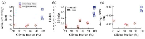Microstructural properties of olivine from the different bands delineated by white boundaries in Figure 4. Olivine (a) grain size, (b) texture strength quantified using the M- and J-indices, and (c) intragrain misorientation quantified using the grain orientation spread (GOS) are plotted against the area fraction of olivine grains.
