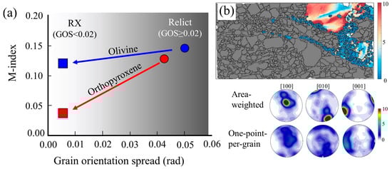 (a) Comparison of the crystallographic preferred orientation (CPO) strength for olivine and orthopyroxene (opx) porphyroclasts grains (GOS ≥ 0.02 rad) and recrystallized grains (GOS < 0.02 rad). While olivine grains show no change in the CPO strength, recrystallized opx grains show a significant reduction in CPO strength. (b) Opx porphyroclast grain with a characteristic tail structure of recrystallized grains depicted through its intragrain misorientations (blue to red). Olivine grains are shown in grey. Pole figures of the opx grains are shown as both area-weighted (highlighting the porphyroclast grain orientation) and one-point-per-grain (highlighting the contribution of the small recrystallized grains). Notice the dispersion of the recrystallized grains. See Figure S1 in the Supplementary Materials to see more comparisons between the olivine and opx CPO for relict and recrystallized grains and the associated EBSD maps for the data presented in panel (a).