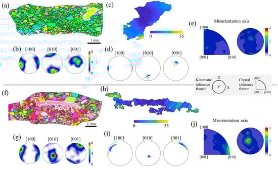 Analysis of grains with small angles of intragrain misorientation (<10 degrees), defining subgrain boundaries, can be used to constrain the mechanism/s and kinematics of deformation [58]. Grains with high internal misorientations (e.g., large grains with warm colors in Figure 3b,c, for olivine and opx, respectively) presumably represent porphyroclast (i.e., large grains that were present before the rapid deformation stage). These grains were picked for subgrain boundary analysis to constrain the dominant slip system and the deformation geometry experienced by each specific grain (Figure 7 and Figure 8). For olivine, we expect subgrain boundaries to reflect the (010)[100] slip system in accordance with its bulk A-type CPO [24]. However, subgrain analyses show more evidence for the (001)[100] slip system than the (010)[100] slip system [42]. This discrepancy between bulk CPO and sub-grain boundary in xenoliths from the Wyoming Craton was discussed by Chin et al. [42], and similar observations have been reported for samples from other locations and tectonic regimes; in general, these observations are interpreted to reflect complex strain histories in continental settings that could result in an apparent mismatch between bulk and subgrain fabric [28,59]. Figure 7 highlights two porphyroclasts with high intragrain misorientation surrounded by recrystallized grains (i.e., low intra-grain misorientations). The first grain (Figure 7a–e) with a relatively small misorientation shows that most of the rotation occurs in the [100] and [010] and bulk orientation consistent with A-type (i.e., [100] aligned with lineation, [010] aligned quasi-perpendicular to the foliation); the area containing the surrounding grains displays a clear A-type fabric (Figure 7b). The second porphyroclast (Figure 7f–j) shows evidence for the (001)[100] slip system, with the misorientation axis aligned with the crystallographic [010] axis, which is parallel to the kinematic Y-axis; the surrounding grains exhibit an E-type fabric with the [100] rotated anti-clockwise to the lineation [56,57,60] and [001] sub-perpendicular to the shear plane (Figure 7g).