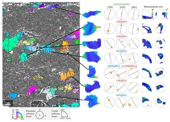 Opx porphyroclasts are larger than olivine porphyroclasts, significantly less recrystallized, and exhibit large areas with high intragrain misorientation. Due to their large size, they can also show a significant spread of the intragrain orientations (e.g., Figure 7i), which can be used for investigating the active slip system/s and the kinematics of deformation. In addition, opx slip systems are less diverse than olivine, showing evidence for (100)[001] or (010)[001] [61], which (by consistency) can help in constraining the kinematics of deformation and, thus, also the dominant olivine slip system. The subgrain boundary analysis of opx in Figure 8 shows seven grains. In the sample reference frame, the misorientation axes are dominantly aligned near the sample Y-axis, suggesting simple shear kinematics, and confirm our interpreted kinematic frame. The misorientation axes show evidence for activation of both the (100)[001] and the (010)[001] slip systems. Similar to results for olivine, the bulk opx CPO (Figure 2d) suggests that the (100)[001] slip system is dominant, while subgrain boundary analysis indicates significant activity from both (100)[001] and (010)[001].
