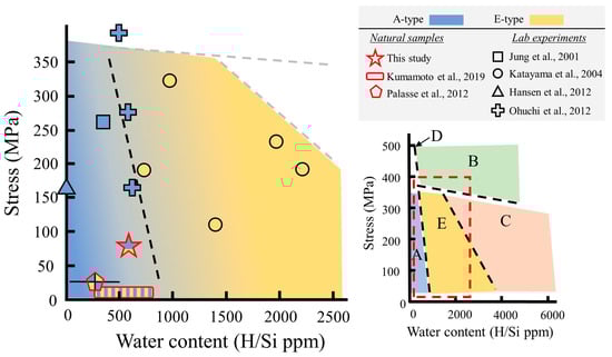 Stress versus COH plot showing conditions for olivine A-type and E-type fabric regimes [60]. Sample H69-15F is shown as a red star. Points from the literature are shown (see legend) delineated by the black (for lab studies) and red (for natural samples) outlines. Water content is shown using the Bell et al. [70] calibration (a constant of 3.5 was used when the Paterson [71] calibration was originally used). Inset, classification of olivine crystallographic preferred orientation types on a plot of stress and water content, after Karato et al. [27]; the red box delineates the condition shown on the left side.