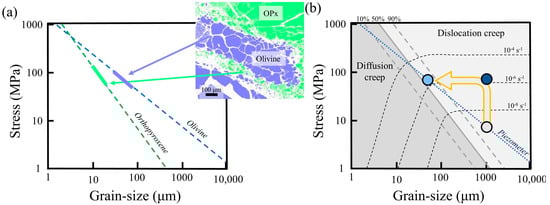A deformation mechanism map was constructed using flow laws for wet olivine [21] under the deformation conditions of the mylonite: T = 1320 °C, P = 4.6 GPa, COH = 548 ppm H/Si (see Table S1, Supplementary Materials). The grain size of olivine porphyroclasts is estimated to be at least 1000 μm (relying on lower strain samples from the same diatreme; [46]) with an average recrystallized grain size of 50 μm. Assuming that the initial grain size formed under steady-state conditions (reflecting the stresses near the base of the lithospheric mantle), the initial stress was <10 MPa. When the rapid deformation event occurred, stresses increased to ~80 MPa; dislocation creep was active during the creation of the initial microstructure (i.e., the porphyroclast population) leading to grain size reduction by dynamic recrystallization. The deformation mechanism map for these conditions of H69-15F shows that, after recrystallization, the conditions are close to the transition between dislocation creep and diffusion creep (Figure 10b). This observation fits the field-boundary hypothesis that the recrystallized grain size will always be at the boundary between dislocation and diffusion deformation mechanisms due to the energy balance between grain size reduction and grain growth [77].