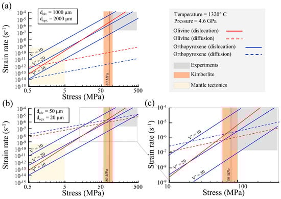 Strain rate vs. stress for olivine (red) and orthopyroxene (blue) for dislocation creep (solid lines) and diffusion creep (dashed lines). (a) Strain rates calculated for an assumed pre-deformation grain size (based on the size of porphyroclast grains) of 1 and 2 mm for olivine and orthopyroxene, respectively. The flow law parameters used are given in Table S1, Supplementary Materials. (b) Strain rates calculated for the recrystallized grain size of olivine and opx. (c) Expanded view of (b) for the range of conditions constrained from analysis of the kimberlitic sample; V* is the activation volume in units of (106 m3/mol).