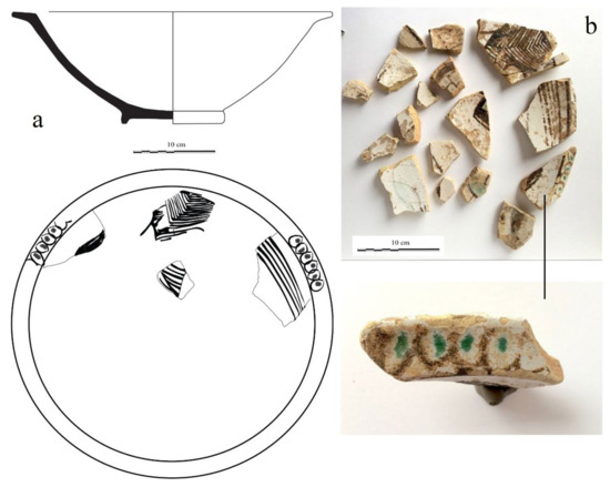 (a) Drawing of the imported ataifor SM-38 and (b) photos of the white opaque glazed layer and the decorative motifs applied.