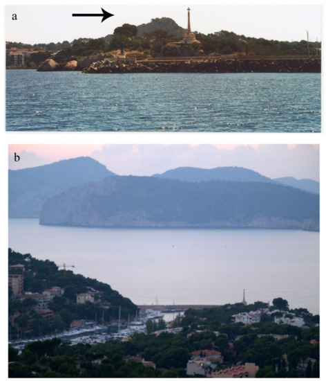 Location of the archaeological site of Puig de Sa Morisca. (a) Views of the site from the sea (Source: ArqueoUIB research group) and (b) visual control of the coastal area and the port from the hilltop.