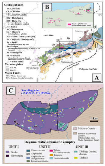 Geological map of studied area with sample locality. (A) Geotectonic map of SW Japan modified after [7]. (B) Distribution of major bodies of the Oeyama ophiolite unit. (C) Geological map of the Ooeyama mafic–ultramafic complex modified after Kurokawa (1985) [39].