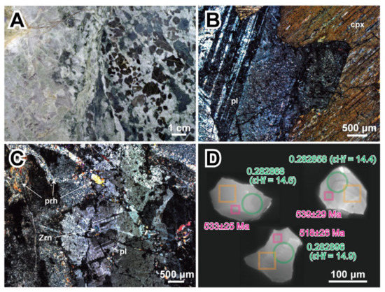 Sample photos. (A) Photo of the cut section of the rock sample. The right side is the main gabbro part (sample number OER-01), and the left side is the vein of the anorthositic part (OER-02). (B) Thin sectional view of the OER-01, which is mainly composed of diallage CPX and plagioclase. (C) Thin sectional view of the OER-02 mainly consists of saussuritized plagioclase and prehnite. (D) Cathodoluminescence images of zircon grains from the sample OER-02. Pink squares show analytical spots of U–Pb dating, whereas green circles show those of Lu–Hf isotopic analysis and orange squares show trace element analysis. pl = plagioclase, cpx = clinopyroxene, prh = prehnite, Zrn = zircon.