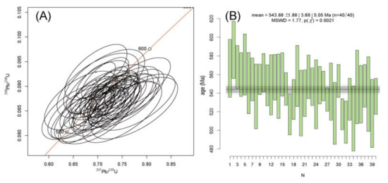 Results of U–Pb dating. (A) Concordia diagram of analytical results of zircon from the sample OER-02. (B) Weighted mean of 238U–206Pb ages selected data which are plotted on the concordia line in A. All plots were generated by using IsoplotR [68].