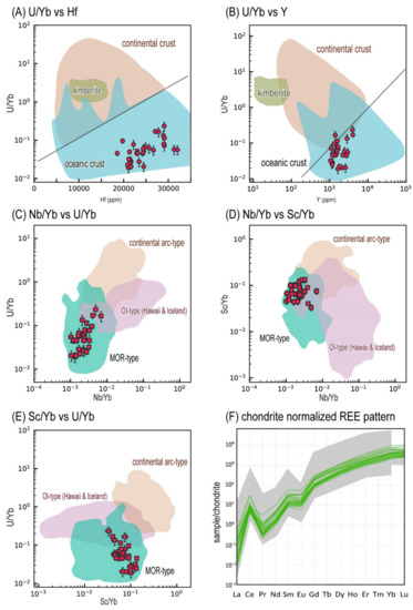 Trace element analysis of zircon from the sample OER-02. (A) Hf concentration vs. U/Yb ratio, (B) Y concentration vs. U/Yb ratio [27], (C) Nb/Yb ratio vs. U/Yb ratio, (D) Nb/Yb ratio vs. Sc/Yb ratio, (E) Sc/Yb ratio vs. U/Yb ratio [26], (F) chondrite-normalized rare earth element pattern. Gray-filled areas indicate the composition of typical zircons from oceanic crustal rocks [27].