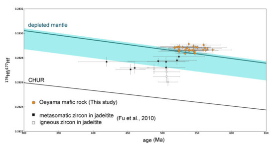 Zircon U–Pb age versus initial Hf isotopic ratio diagram for the present results of Lu–Hf isotope analysis of the Oeyama mafic–ultramafic complex and previously reported data for zircons in jadeitite from the Osayama area by [34]. Depleted mantle domain shown in green and CHUR (Chondritic uniform reservoir) curve of a black curve were defined by [69,70].