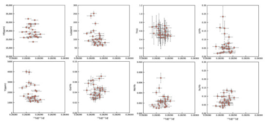 Plots of initial 176Hf/177Hf isotopic ratio versus trace element concentration or trace element ratio of zircons in sample OER–02 (anorthositic vein in gabbroic rock) from the Oeyama mafic–ultramafic complex.