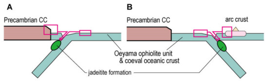 Two possible model to explain the present zircon Hf isotopic analysis for a gabbroic rock from the Oeyama ophiolite unit and that of the jadeitite associated with the ophiolite unit. (A) The initial subduction was landward and the jadeitite was formed from the Precambrian continental crust (CC) in the Rodinia fragments and the oceanic crust coeval to the Oeyama ophiolite unit. (B) The initial subduction was oceanward and started at > ca. 600 Ma. The source of the jadeitite was a mixture of the oceanic crust coeval to the Oeyama ophiolite unit and the arc crust formed through the subduction.