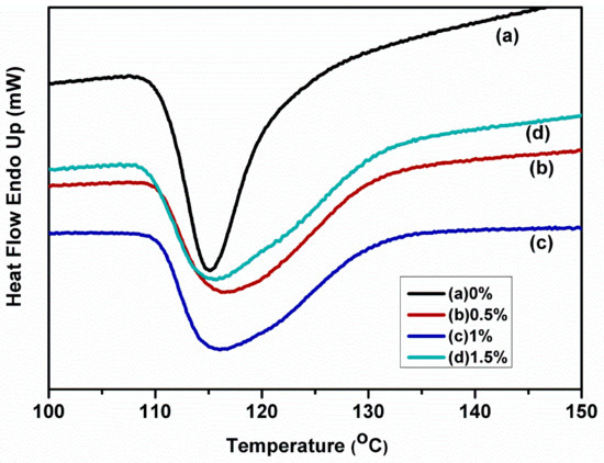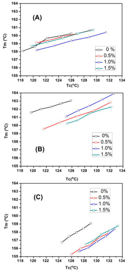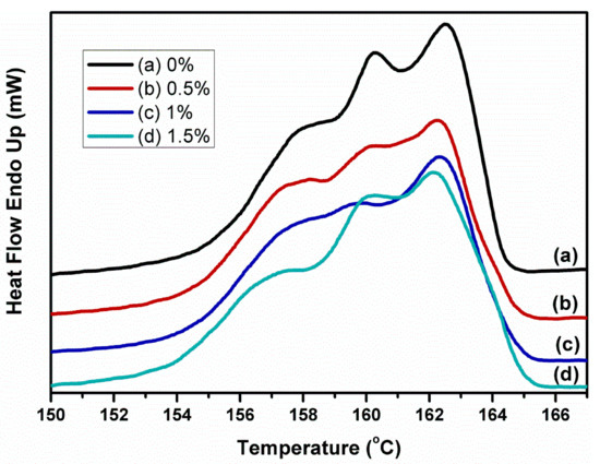 3.4. Non-Isothermal Crystallization of the PLLA-PEG/o-MMT Nanocomposites