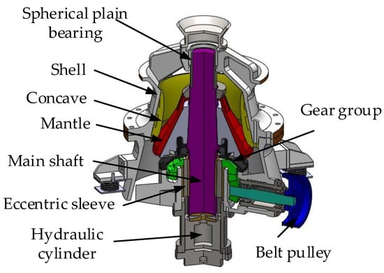 The structure of the cone crusher is shown in Figure 1. The power is imported into the cone crusher through the belt pulley so that the rotation of the eccentric sleeve is driven by the gear group. The eccentric sleeve is assembled in the main shaft which the upper end is fixed by the spherical plain bearing and the lower end is supported by the spherical thrust bearing at the top of the hydraulic cylinder. The rotation of the eccentric sleeve forces the main shaft to rotate around the central axis of the cone crusher. The mantle assembled on the main shaft rotates eccentrically around the central axis of the cone crusher and makes reciprocating motion relative to the concave installed on the inner surface of the shell.