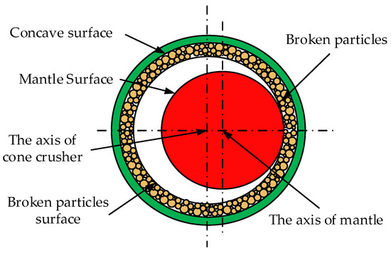 The mantle is mounted on the main shaft of the cone crusher. The mantle rotates eccentrically around the central axis of the cone crusher, as shown in Figure 2. Thus, the particles in the crushing chamber are broken due to the squeeze caused by the reciprocating motion of the mantle to the concave. Due to the friction between the mantle surface and the surface of the broken particles, the rotating motion of the mantle around its central axis is caused, as shown in Figure 2. The rotation direction of the mantle around its central axis is opposite to the rotation direction of the mantle around the central axis of the cone crusher.