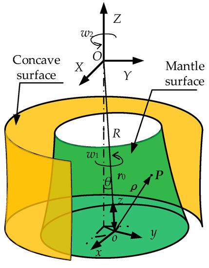 Since the moving coordinate system oxyz rotates around the central axis oz of the mantle, the normal acceleration an of the contact point between the mantle surface and the particle can be expressed by Equation (18).