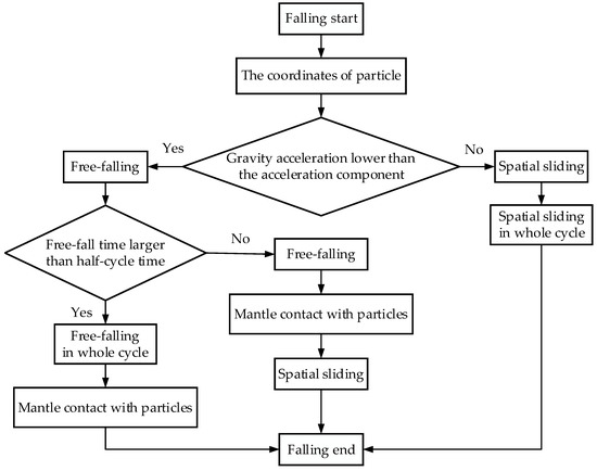 When the particle begins to fall, the initial position coordinates of the particle are determined. According to the structural and operating parameters of the cone crusher, the absolute acceleration component of the contact point between the mantle surface and the particle in the direction of gravity is determined. The motion characteristics of the particle are determined by comparing the gravitational acceleration and the acceleration component of the contact point. If the gravitational acceleration of the particle is less than the acceleration component of the contact point, the free-falling acceleration of the particle is less than the acceleration of the mantle surface moving away from the particles. Therefore, the motion characteristic of the particle is free-falling. By comparing the free-falling time of the particle and the half-cycle time of mantle rotation, the motion characteristic of the particle can be further determined. If the free-falling time of the particle is larger than the half-cycle time of mantle rotation, the particle contacts with the mantle surface during the movement from the surface OSS to the surface CSS. Therefore, the motion characteristic of the particle in the whole cycle is determined as free-falling. If the free-falling time of the particle is less than the half-cycle time of mantle rotation, the particle contacts with the mantle surface during the movement from the surface OSS to the surface CSS. The particle slides along the mantle surface and moves with the mantle surface until the mantle reaches the surface OSS. Thus, the motion characteristic of the particle is determined as the spatial compound falling consisting of free-falling and spatial sliding. If the gravitational acceleration of the particle is larger than the acceleration component of the contact point, the free-falling acceleration of the particle is larger than the acceleration of the mantle surface moving away from the particles. The particle slides along the mantle surface and continues to move with the mantle surface until the mantle reaches the surface OSS. Thus, the motion characteristic of the particle in the whole cycle is determined as spatial sliding.