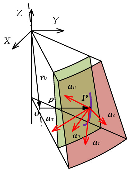 The absolute acceleration aP of particle P which motion characteristic is spatial sliding can be obtained by Equation (15).
