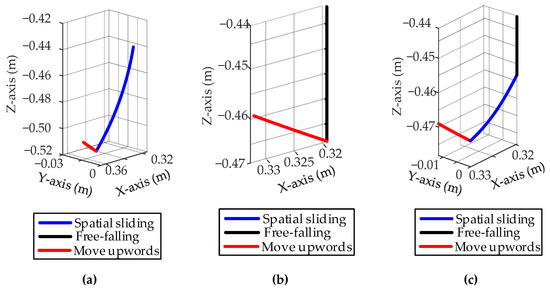 The motion characteristics of particles. (a) The spatial sliding. (b) The free-falling. (c) The spatial compound falling.